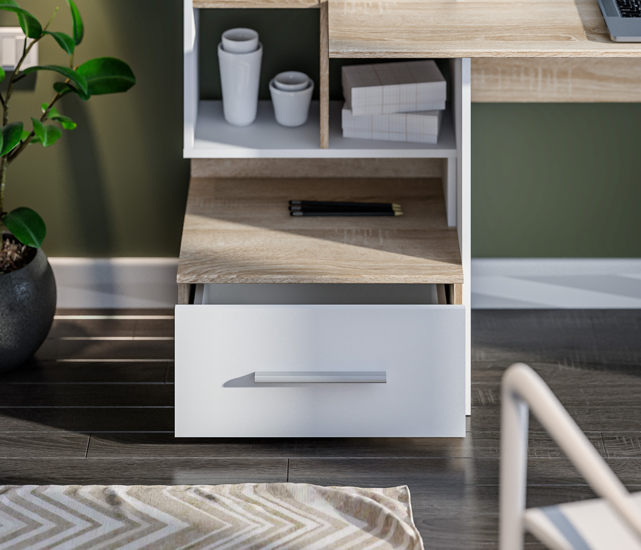 Оформление отделки комбинированное. Корпус выполнен в цвете «Дуб Сонома», фасадные поверхности – в белом цвете. Материал корпуса - КДСП, материал фасадов - ЛДСП.