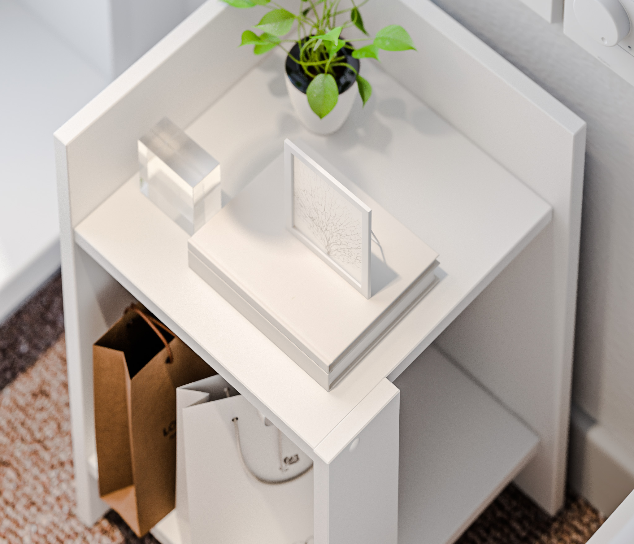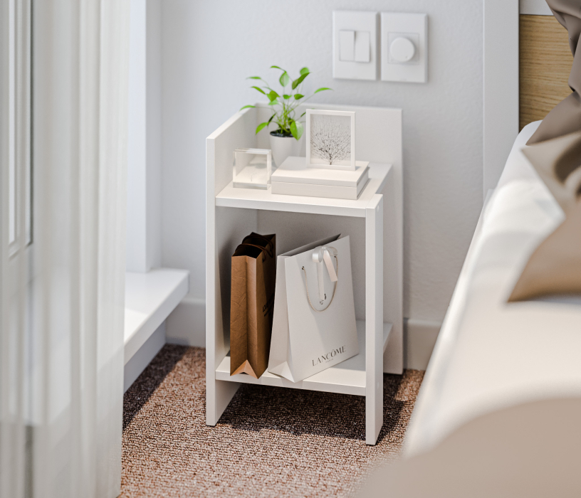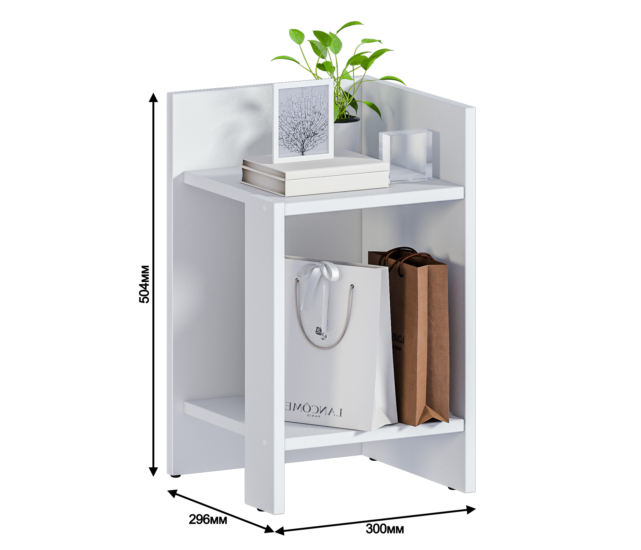При компактных габаритных размерах – ширина 30см, высота 50,4 см и глубина 29,6 см, тумба довольно вместительная: на имеющихся полочках можно разместить книги, аксессуары и предметы декора. Тумбу можно использовать и как придиванный столик, за которым можно перекусить или выпить чашечку чая.
