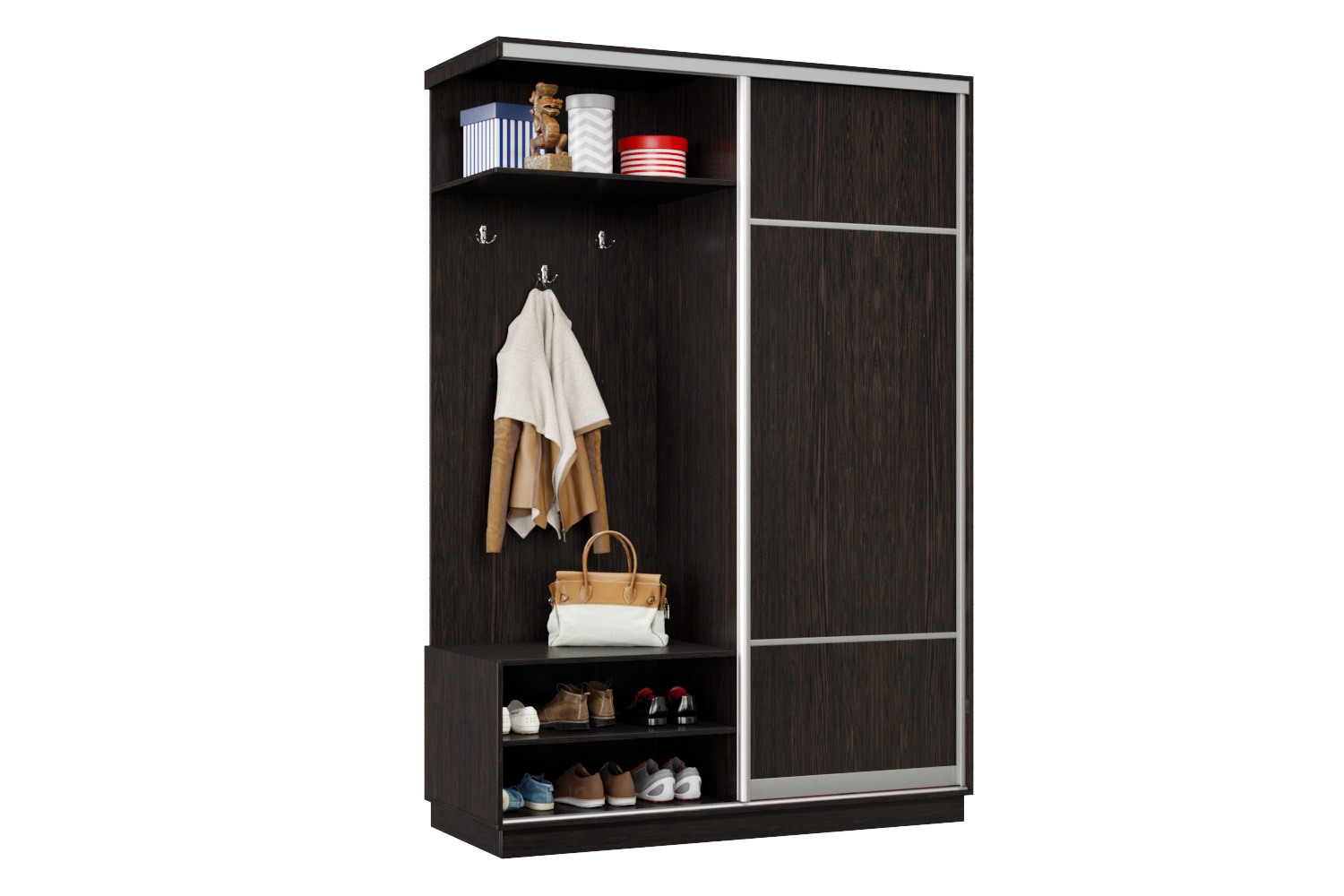 Дверь делит шкаф на 2 равные части: отделение для верхней одежды и отделение с полками и крючками.