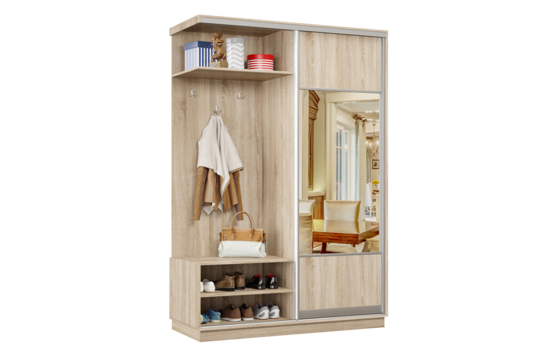 За счет применения системы купе прихожая отлично зарекомендовала себя в узких коридорах, где распашная дверь ограничивает пространство. Несмотря на небольшие габариты, прихожая-купе получилась функциональной и практичной.