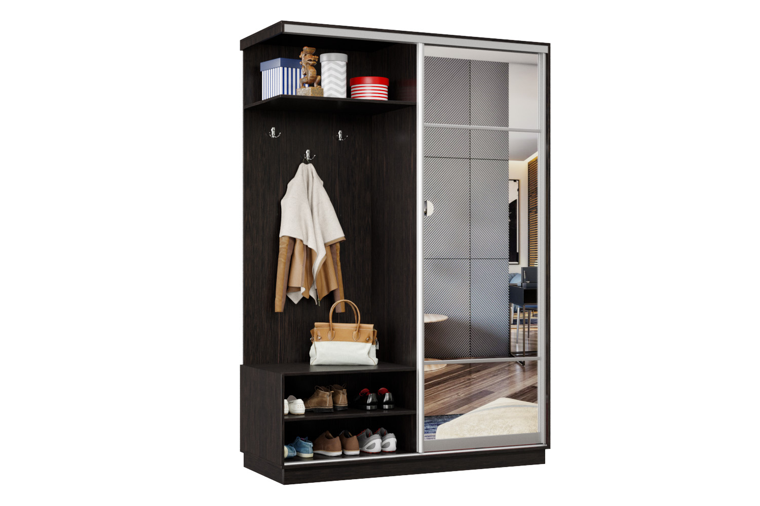 В прихожей используется одна дверь, которая перемещается по однополосному треку вправо или влево, закрывая или открывая каждую из двух частей шкафа.