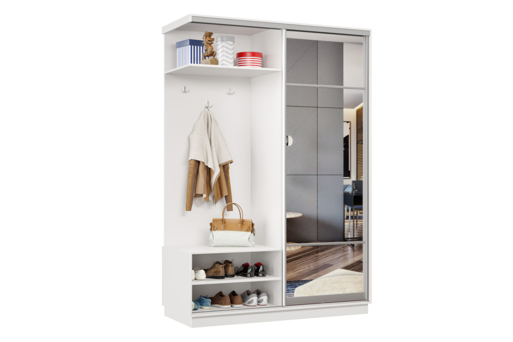 В прихожей используется одна дверь, которая перемещается по однополосному треку вправо или влево, закрывая или открывая каждую из двух частей шкафа.