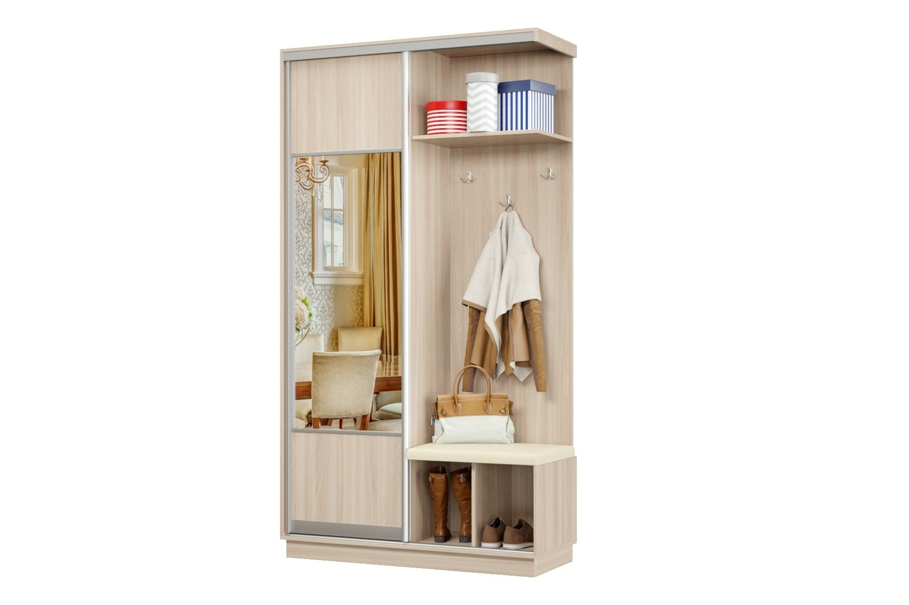 Дверь делит шкаф на 2 равные части: отделение для верхней одежды и отделение с полками и крючками.