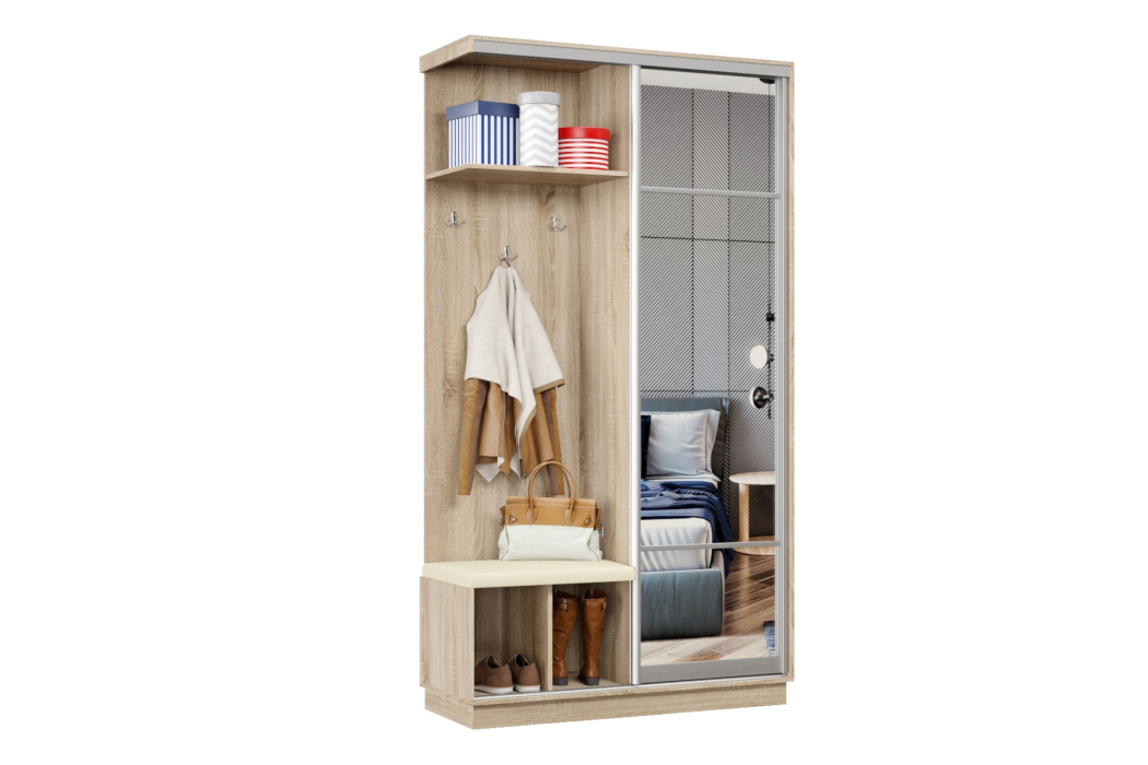 В прихожей используется одна дверь, которая перемещается по однополосному треку вправо или влево, закрывая или открывая каждую из двух частей шкафа.