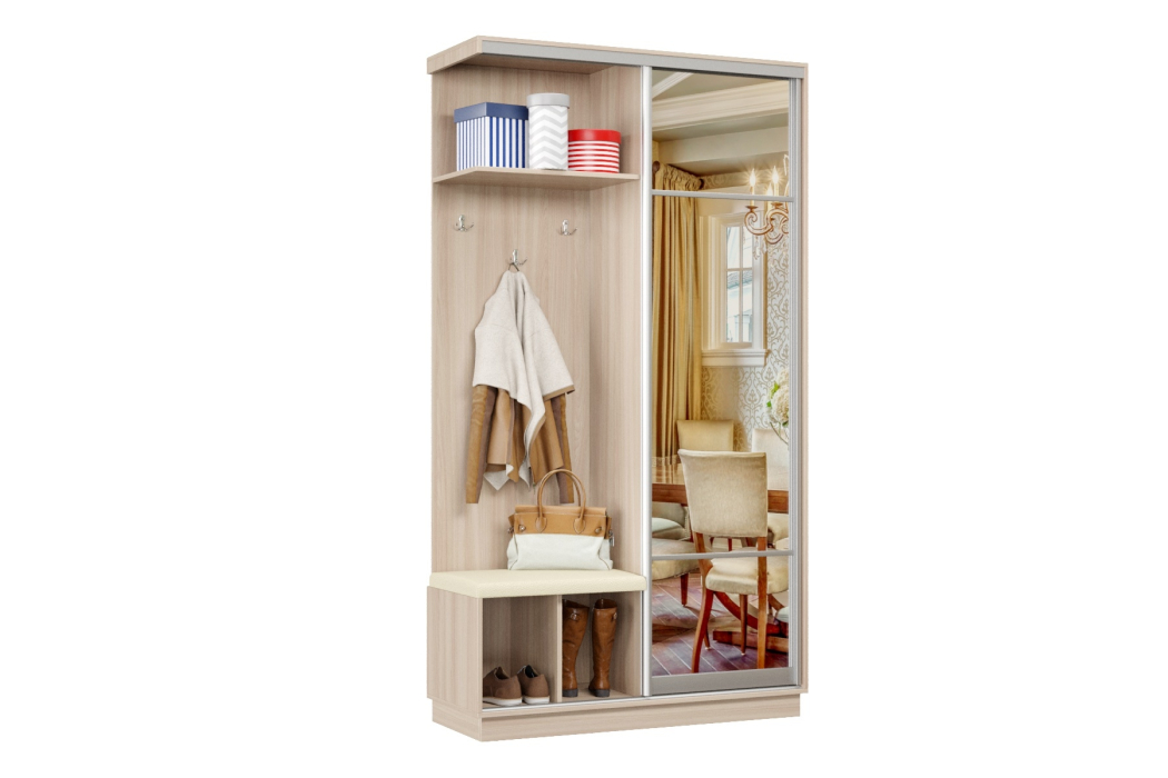 За счет применения системы купе прихожая отлично зарекомендовала себя в узких коридорах, где распашная дверь ограничивает пространство. Несмотря на небольшие габариты, прихожая-купе получилась функциональной и практичной.