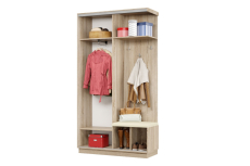 Дверь делит шкаф на 2 равные части: отделение для верхней одежды и отделение с полками и крючками.