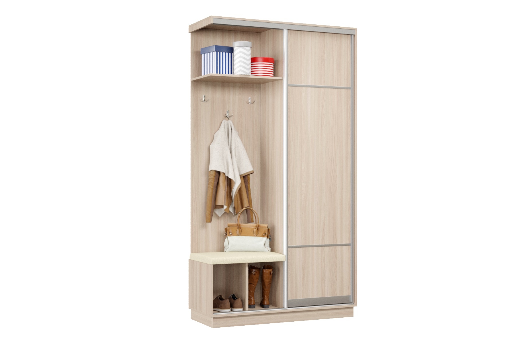 Дверь делит шкаф на 2 равные части: отделение для верхней одежды и отделение с полками и крючками.