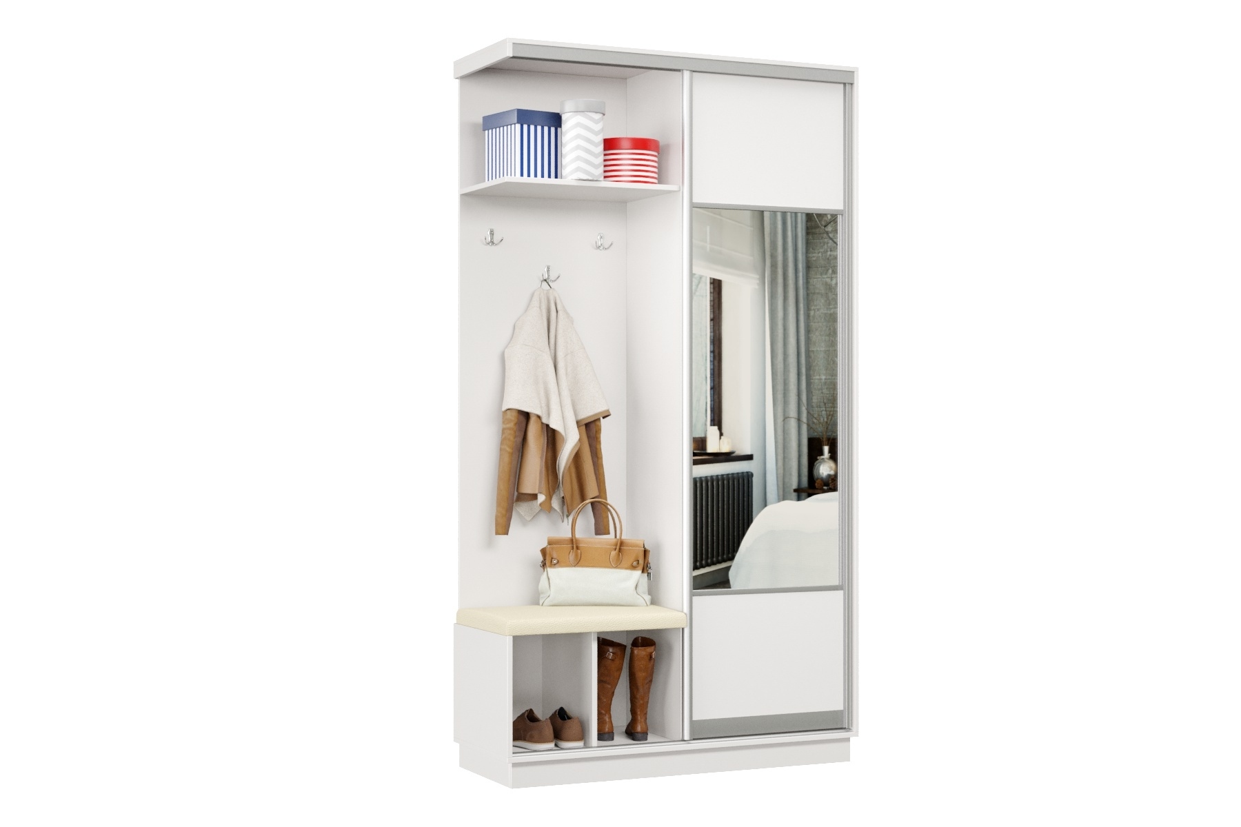 Дверь делит шкаф на 2 равные части: отделение для верхней одежды и отделение с полками и крючками.