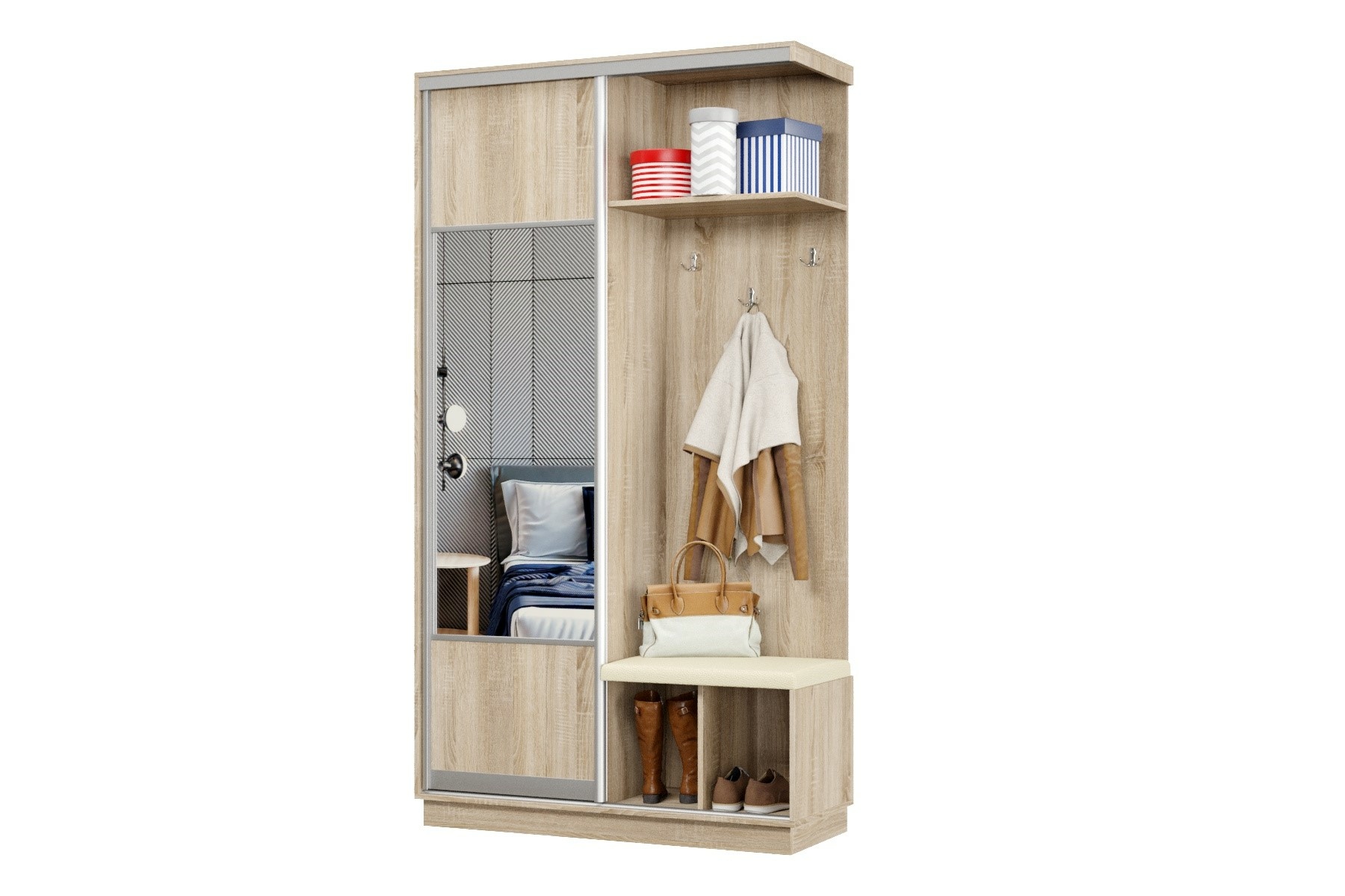 Дверь делит шкаф на 2 равные части: отделение для верхней одежды и отделение с полками и крючками.