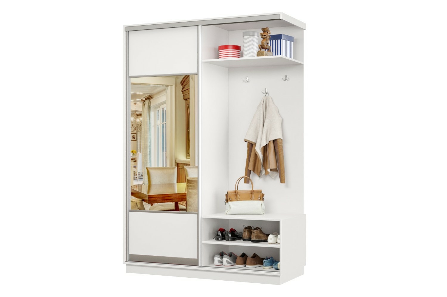 В прихожей используется одна дверь, которая перемещается по однополосному треку вправо или влево, закрывая или открывая каждую из двух частей шкафа.
