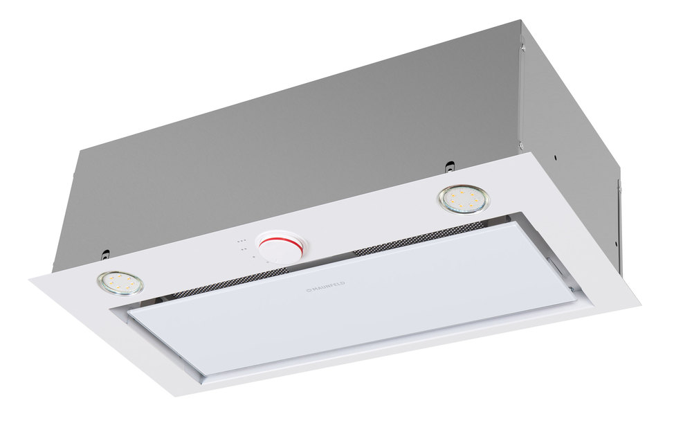 Корпус сделан из нержавеющей стали. На фасаде белого цвета находится откидная панель, выполненная из закаленного белого стекла. За ней располагается легко снимающийся жироулавливающий алюминиевый фильтр. Вся фурнитура выполнена в белом цвете. Загрязненный воздух втягивается по периметру откидной панели.