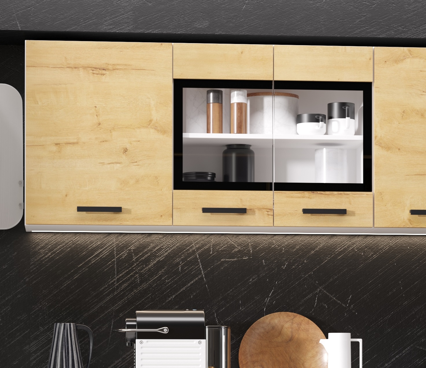 два верхних шкафа: первый шкаф - общая ширина 1200мм (500мм , 700мм со стеклом). Внимание! Это единый элемент, разъединить шкафы невозможно! Второй шкаф: на 800мм. Высота 626мм. Глубина 270 мм.
