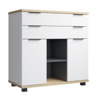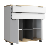 Комод имеет два широких выдвижных ящика и два ящика с дверцами. Две открытые ниши могут быть использованы для хранения вещей или игрушек.