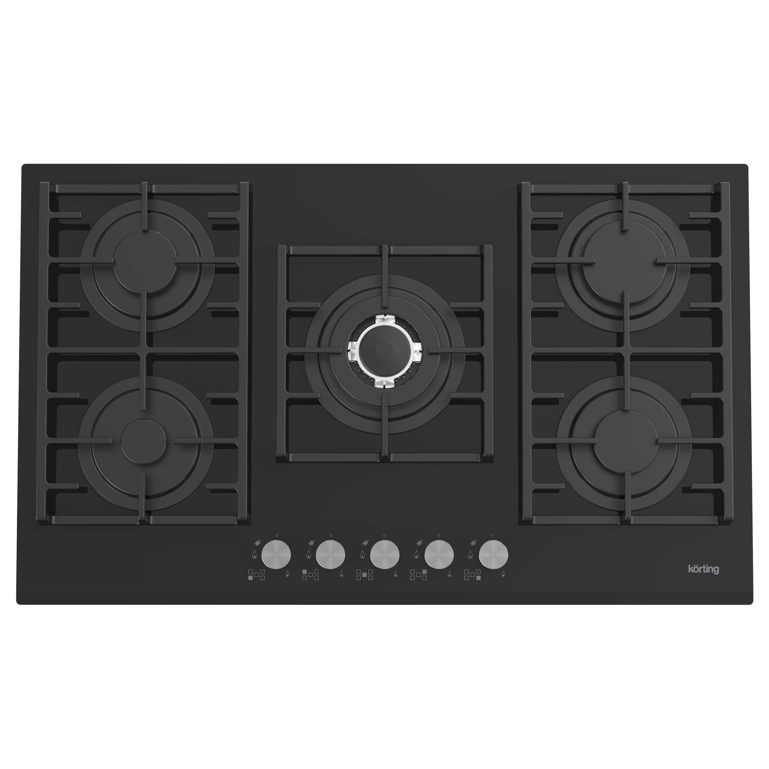Газовая варочная панель из закаленного стекла, ширина 90 см, 5 высокоэффективных конфорок, сверхмощная конфорка WOK 3,8 кВт, автоматический электроподжиг, газ-контроль каждой конфорки, передние металлические переключатели, чугунные решетки для посуды, в комплекте - чугунная подставка WOK, адаптер для кофейника, скошенный передний край.