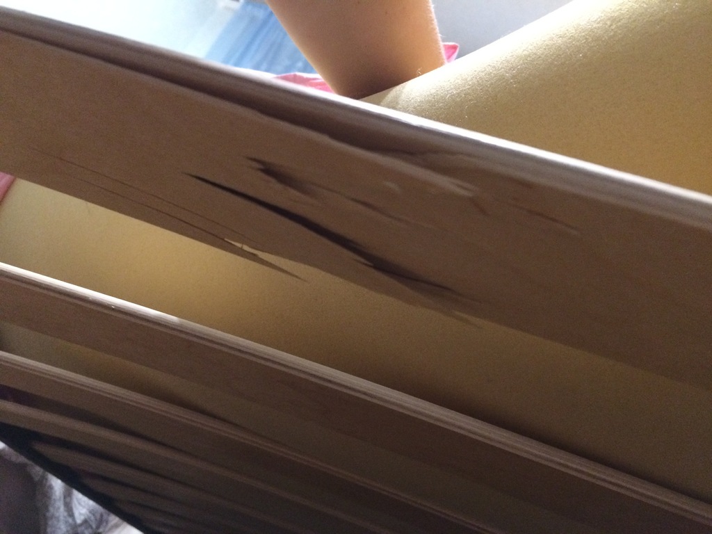 Деревянные перекладины очень хрупкие, одна была треснута и при первом использовании кровати, сев на край она хрустнула и разломилась в щепки, стали осматривать остальные, нашли ещё одну которая похрустывала, но держалась, может из за того что она ближе к середине расположена...расстояние между перекладинами очень большое, что не очень удобно, и как раз это может и есть причина того, что перекладины сильно подвержены нагрузки.