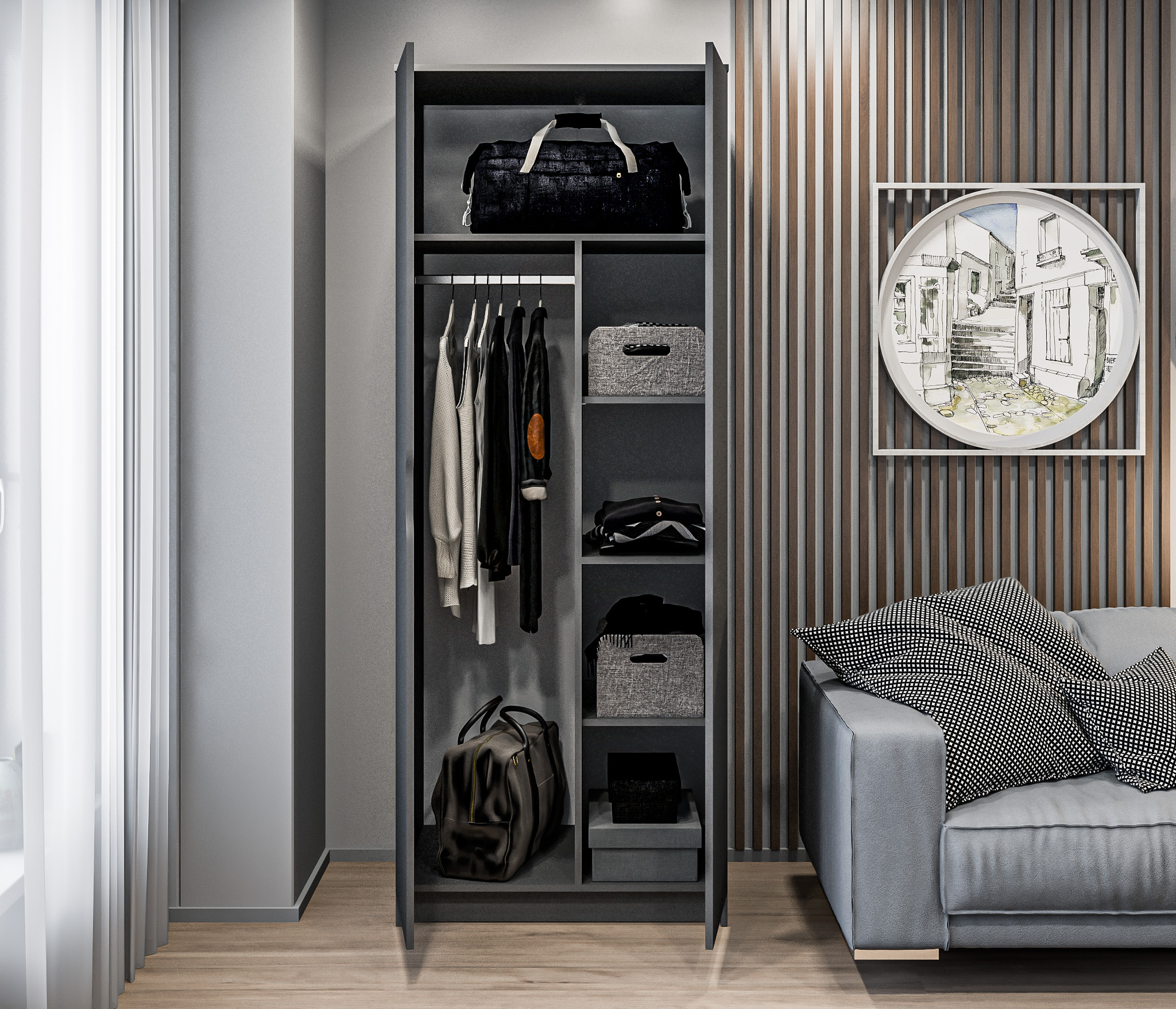 Внутри шкафа расположены четыре полки, на которых вы можете разместить свою одежду, аксессуары и другие предметы. Они обеспечивают удобную организацию и доступ к вещам.