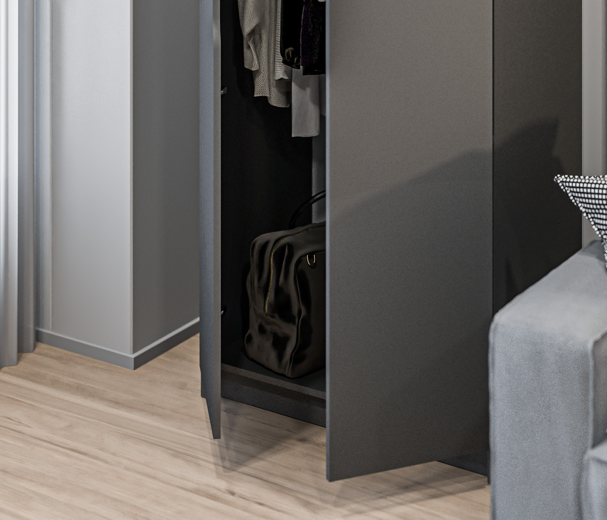 Также внутри шкафа есть штанга для одежды, где вы можете повесить свои вешалки с платьями, рубашками и другими вещами, которые нужно повесить.