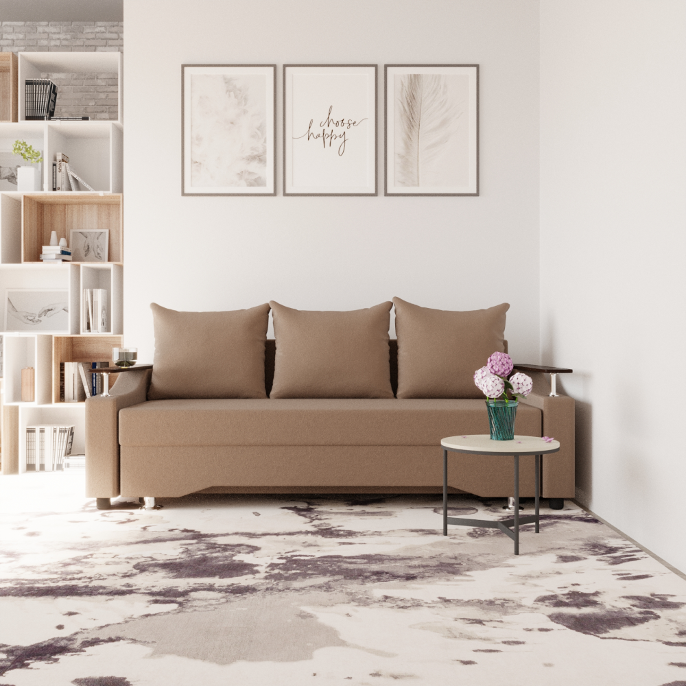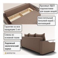 Достоинства: ровное спальное место, лёгкость процесса трансформации дивана, ёмкий бельевой ящик, прочность механизма, долговечность конструкции.
