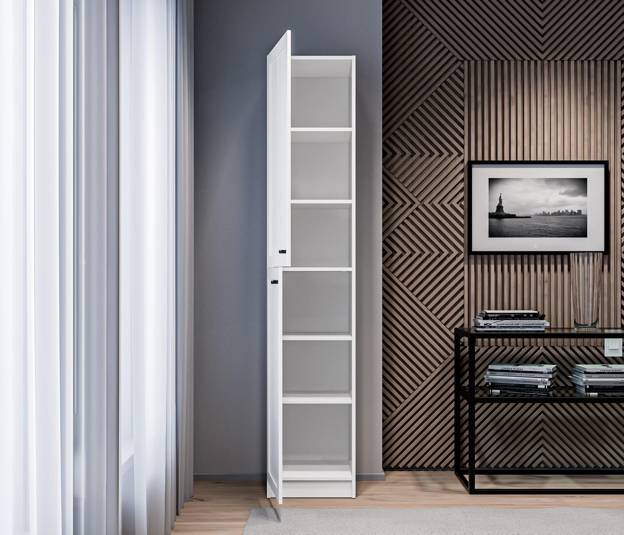 МС Твин предоставляет возможность собрать шкаф или стеллаж по своему вкусу. Вы сами выбираете размеры, цвет ручек: белый или черный, наполнение: ящик или полки. Помимо этого, вы можете решить, оставить фасады глухими или выбрать стеклянные, чтобы добавить прозрачности и легкости в ваш интерьер. Создайте шкаф-стеллаж, который идеально подходит для ваших потребностей и вписывается в ваш стиль.