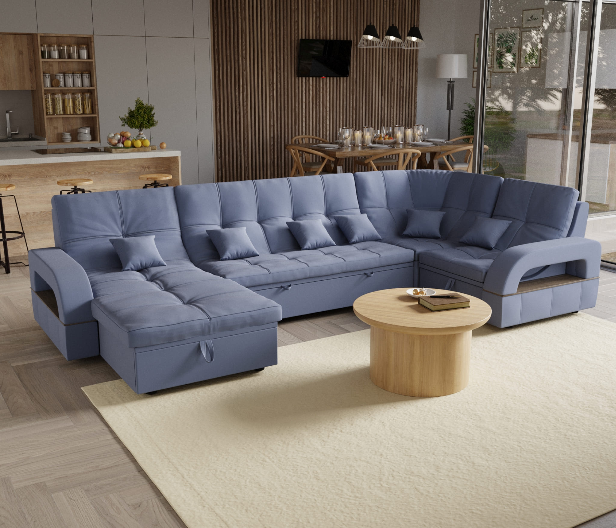 Подушки 6шт в комплекте. В чужих отзывах читала, что сзади ткань другая, но в нашем диване везде ткань одинаковая- его можно поставить посередине комнаты.