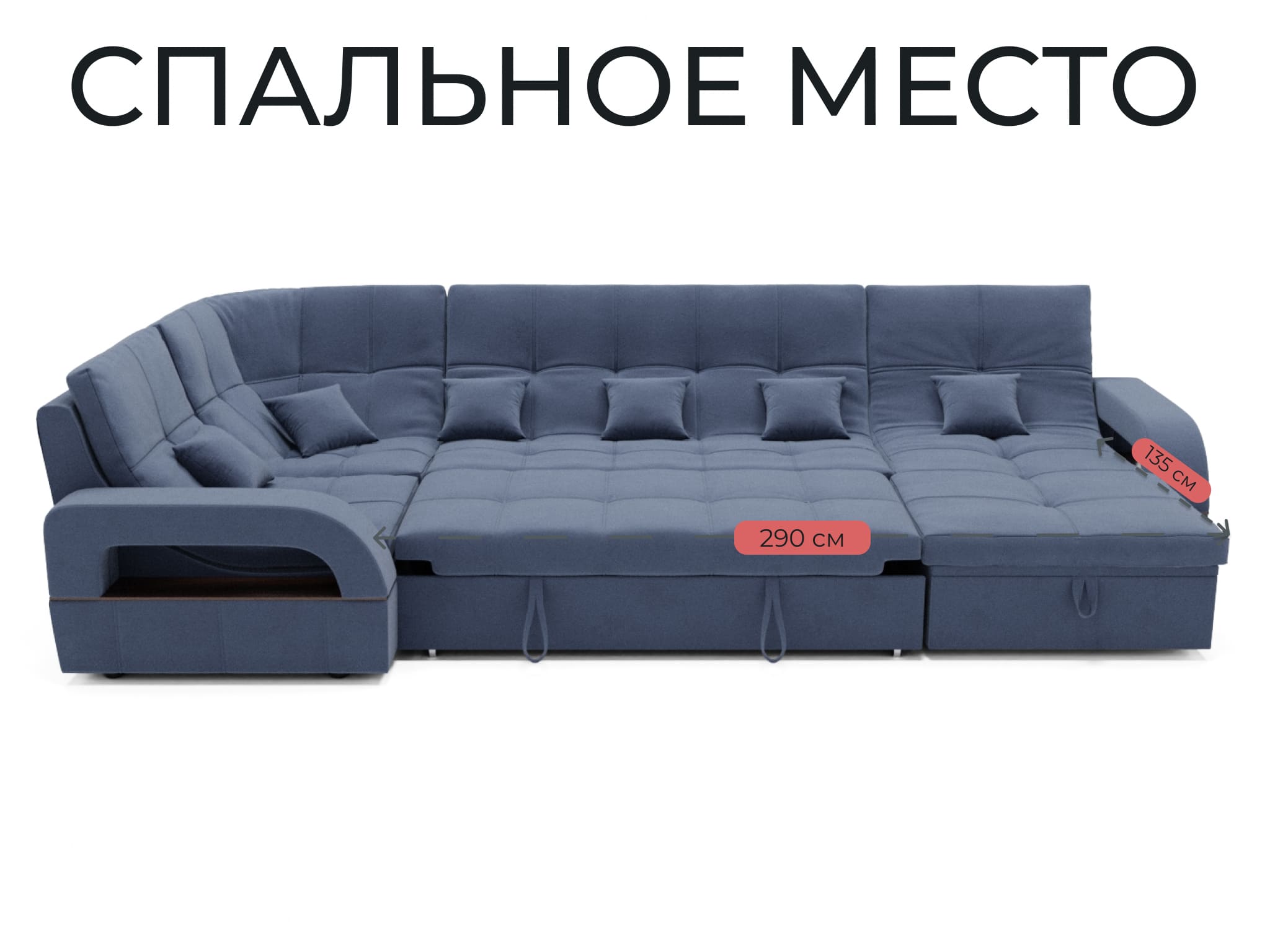 Спальное место имеет ширину 135 см и длину 290 см. Он предназначен для двух человек и имеет глубину сиденья 65 см. Максимальная нагрузка на диван составляет 280 кг.