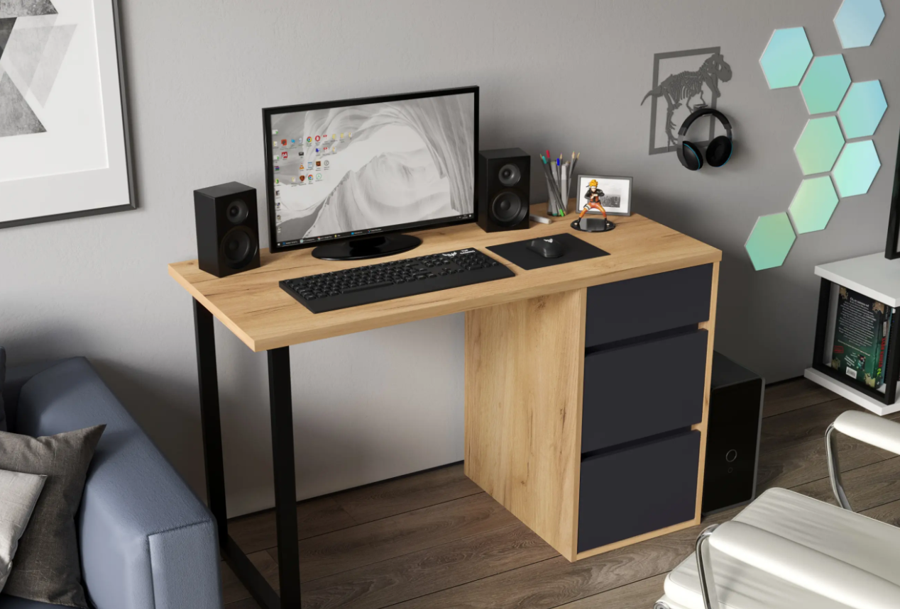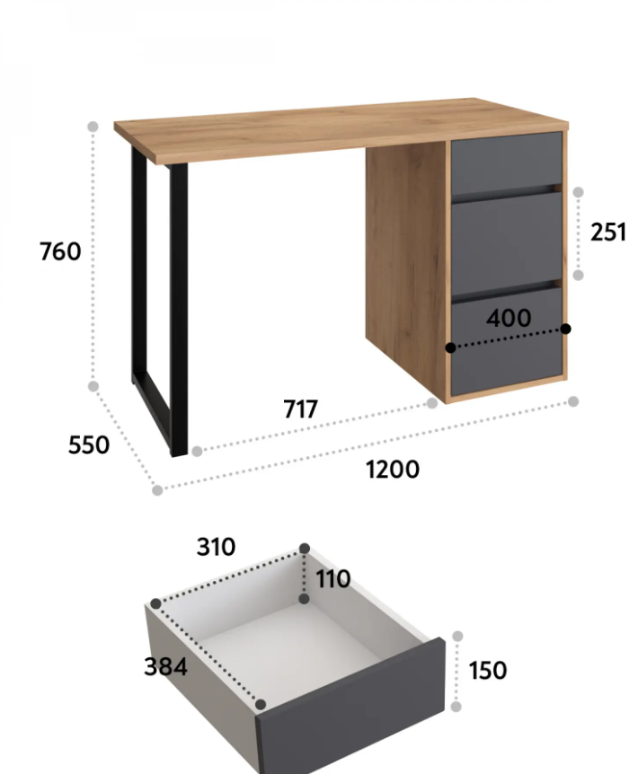 Стол письменный С-401 позволит создать комфортное и стильное рабочее пространство в офисе или домашнем кабинете. Стол С-401 можно использовать в качестве маникюрного стола. Стол имеет прочную стальную опору и тумбу с тремя выдвижными ящиками. Столешница изготовлена из ЛДСП 25 мм. Стол может быть собран в зеркальном варианте «правым» или «левым». Фурнитура: телескопический направляющие полного выдвижения без доводчиков, опора металл.