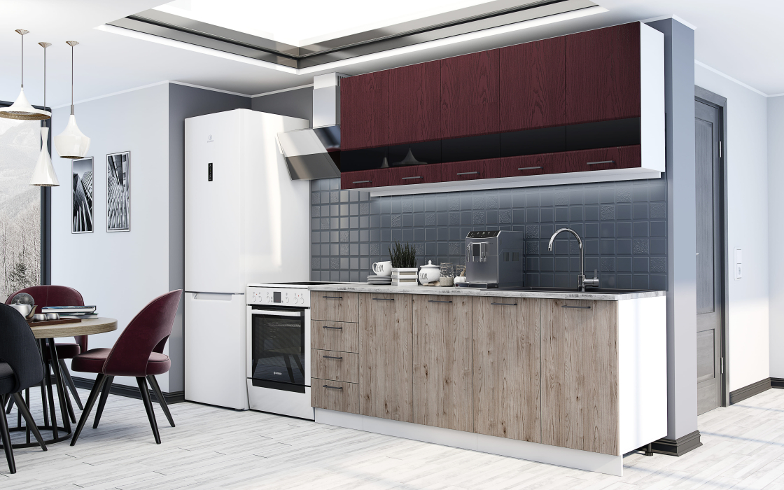 Кухонный гарнитур Астра длиной 2 метра подойдёт как для малогабаритной кухни, дачи, так и для небольшой кухни-гостиной. Кухня выполнена в стиле модерн и органично впишется в современный интерьер. Верхние фасады в цвете насыщенного бордо символизируют власть и силу, целеустремленность и уверенность. Нижние фасады с текстурой благородного дуба дополнят смелую кухню брутальностью. Распашные шкафы и выдвижные ящики вместят всю необходимую посуду, кухонную утварь и продукты. С рабочим пространством 1200*600 мм вы почувствуете себя настоящим шеф-поваром.