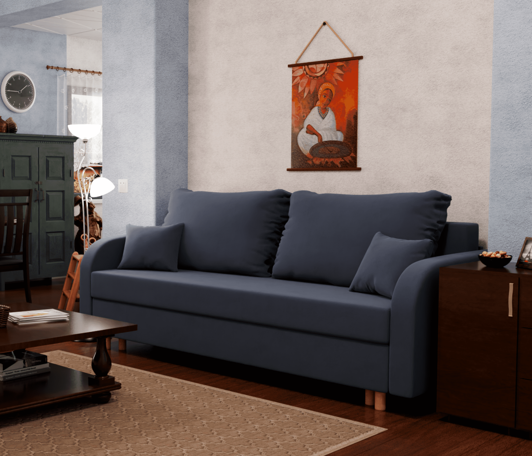 Механизм трансформации "еврокнижка" позволяет легко превратить диван в кровать, что делает его более практичным в использовании. Диван-кровать может использоваться как для сидения, так и для сна.