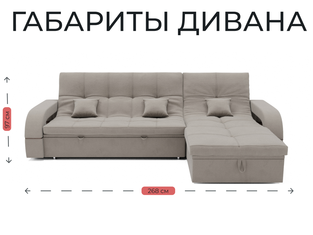 Он имеет высоту 97 см, ширину 268 см и глубину 175 см. Диван обладает универсальным расположением угла, что позволяет его использовать в любом помещении.